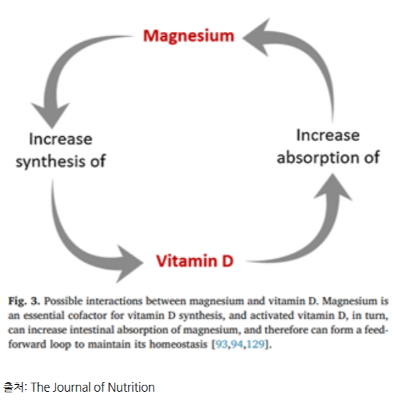 또한 위의 그래프를 보면 마그네슘과 비타민D를 함께 섭취했을 때, 마그네슘 단독 섭취보다 흡수율이 증가했음을 알 수 있다. 또한 마그네슘 역시 비타민 D 합성에 중요한 성분으로 두 영양소는 상호작용이 이루어지기 때문에 함께 섭취하는 것이 좋다.