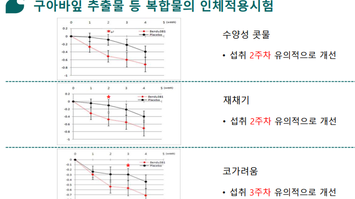 벗어날 수 있게 돕는다. 인체적용시험 결과 섭취 4주 후 수양성 콧물, 재채기, 코가려움에 유의미한 효과가 있었다.