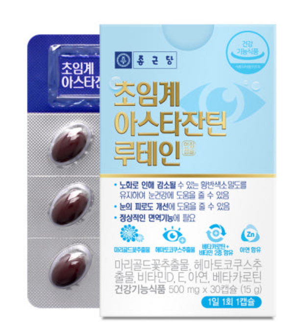 종근당의 제품은 루테인과 아스타잔틴을 함유하고 있지만 오메가3가 빠져있어 조금 아쉽다. 초임계유체추출로 정제한