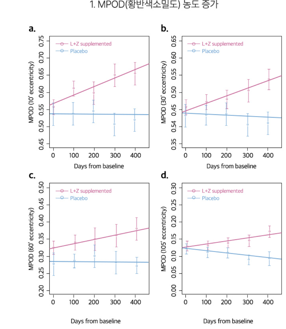 황반 색소 밀도 농도 증가와 혈장 내 루테인 및 지아잔틴 농도 증가에 유의미한 결과를 보였다.