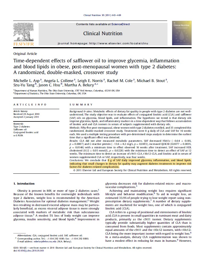 요약: 매일 8g의 홍화씨유를 섭취하면 혈당, 염증, 혈중 지질이 개선되는 것을 확인(CLA는 유의미한 영향X)했다. 이는 식단의 지방 품질을 약간만 바꿔도 당뇨병 치료를 증강시켜 당뇨병 관련 합병증의 위험 요소를 개선할 수 있음을 시사한다.