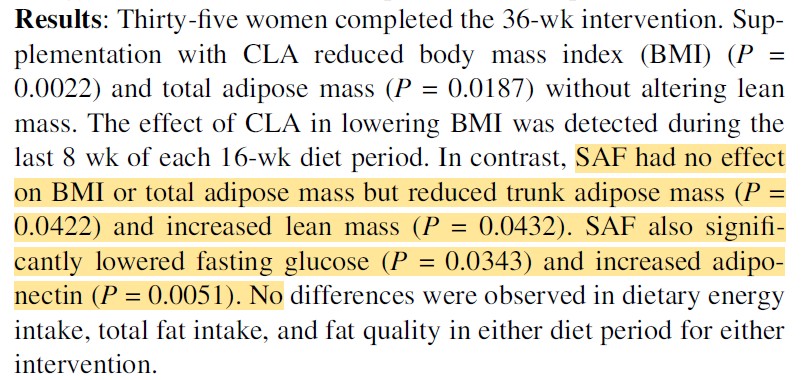결론: CLA와 SAF는 각 지표에 다른 효과가 나타났다. 두 식이오일 보충으로 체중 감량, 혈당 조절 또는 둘 다에 도움이 될 수 있다.