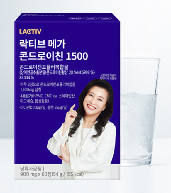 콘드로이친 황산염과 해조칼슘, 초록입 홍합분말 등 콘드로이친 포뮬러 복합물을 1500mg 함유했으나 당류가공품이다. 비타민D3, 셀렌, 아연 등 부원료를 함께 포함해 복합 효과를 기대할 수 있다.