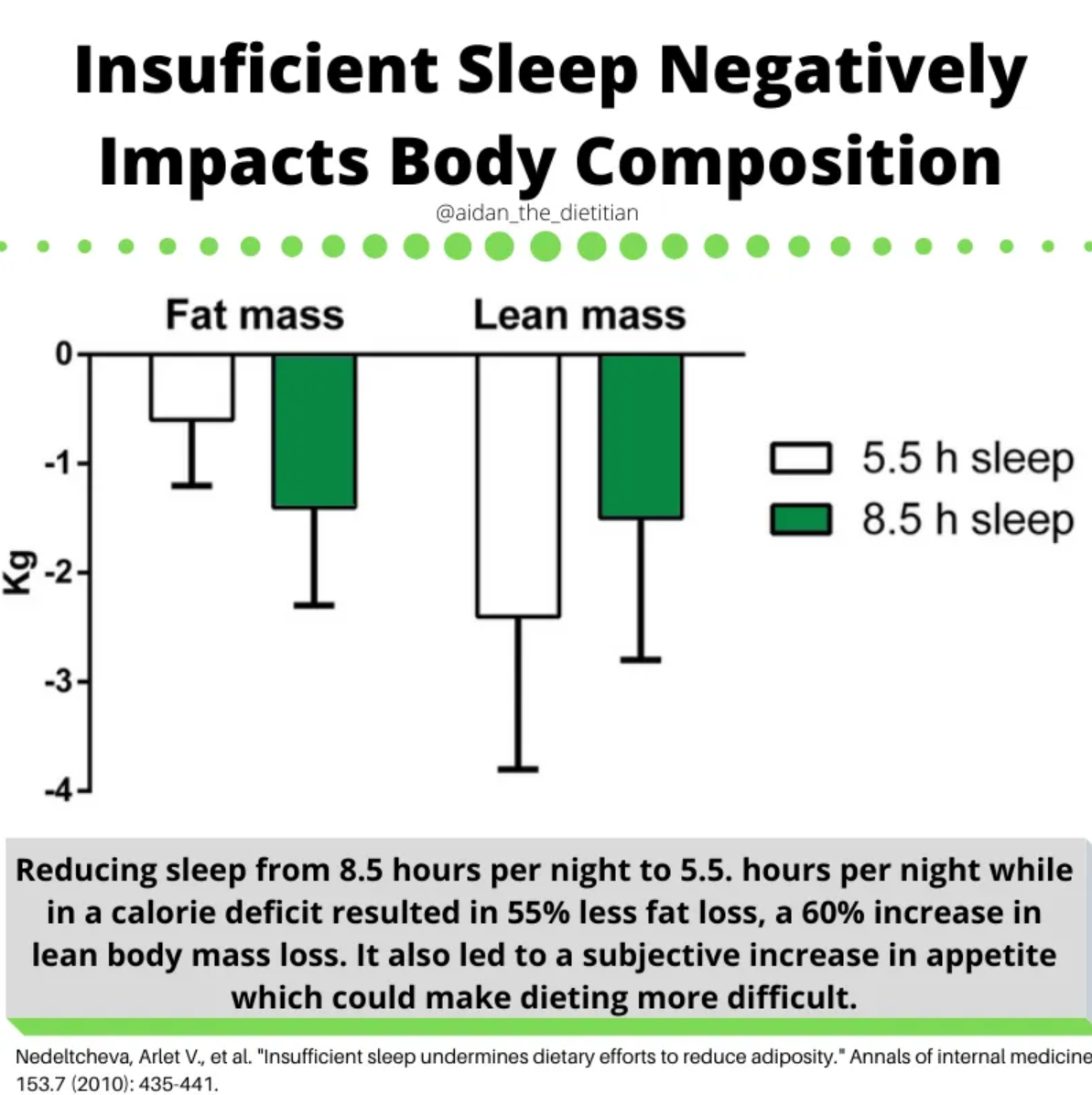 14일간 다이어트하는 두 그룹을 비교한 연구에 따르면, 한 그룹은 8.5시간 수면을, 다른 그룹은 5.5시간 수면을 취했다. 두 그룹 모두 비슷한 양의 체중을 감량했지만, 수면 시간이 적은 그룹은 근육량 감소가 많았고, 수면 시간이 충분한 그룹은 지방 감소가 더 컸다.